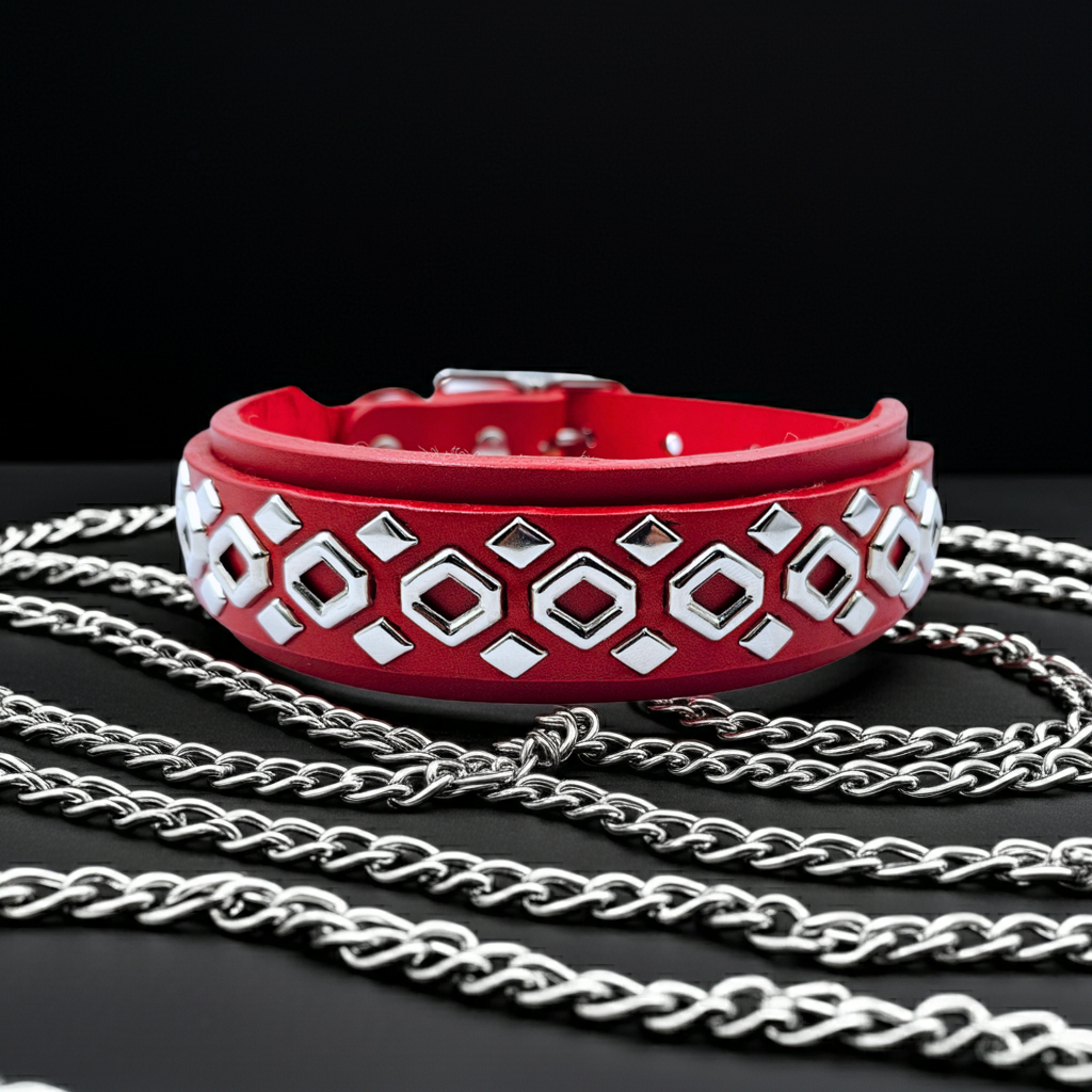 Where form links tightly with fashion; where function is bonded to durability. Add to your dog's wardrobe with the Chain Collar. Made on your choice of bright, premium bridle leather, this collar stands out with our unique chain-style studwork and intricate diamond border. The CHAIN collar is the perfect choice for dogs linked to luxury.